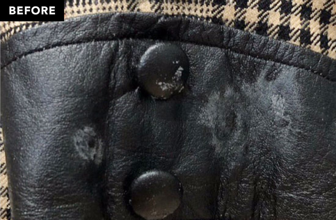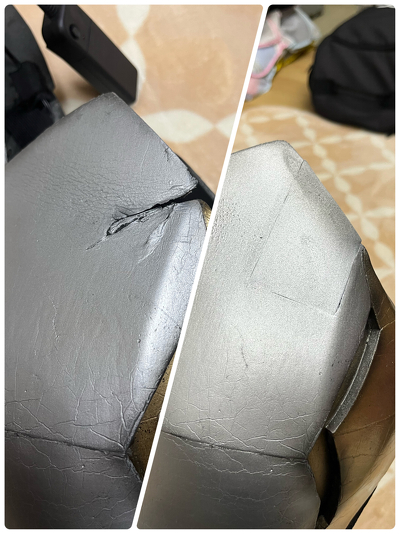写真は劣化によって剥がれた合皮部分を、同じ色で傷みにくい素材を提案させていただき、貼り変えました。